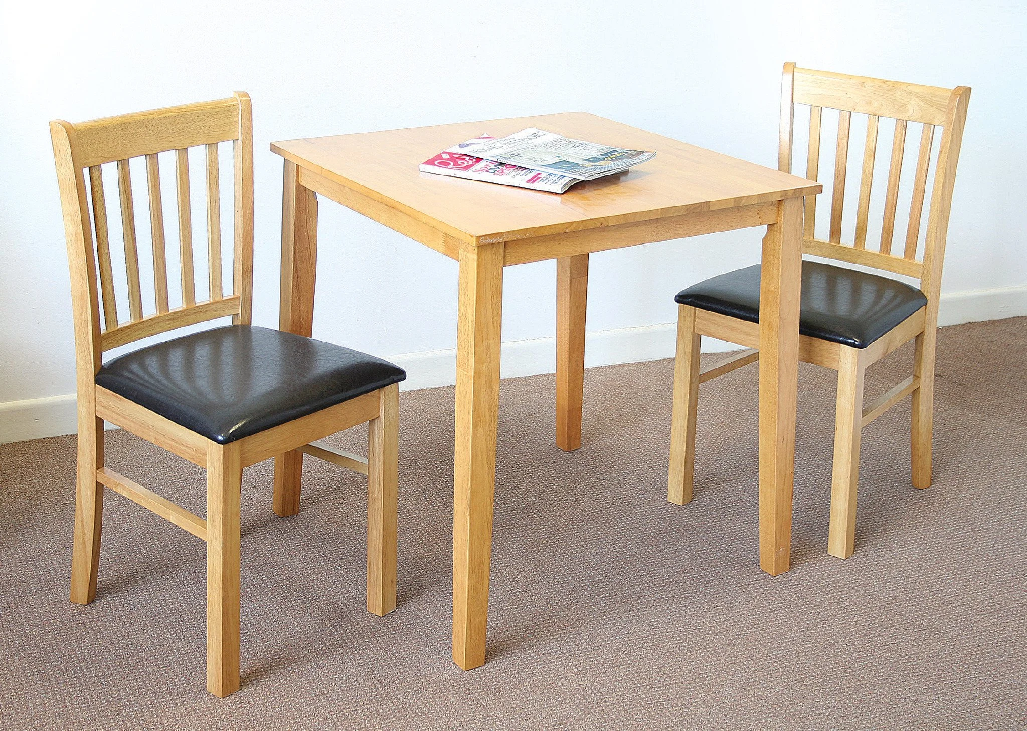 The Galina Light Oak Set with black seat pads is an elegant solution for compact dining spaces. This sturdy, solid wood square table (76cm x 76cm x 75cm) features a beautiful light oak finish that adds warmth and brightness to any room. Paired with two matching chairs, each with a comfortable PU upholstered black seat pad, this set offers both style and durability. Perfect for kitchens, apartments, or cozy dining nooks, the Galina Light Oak Set blends classic design with contemporary comfort for everyday use